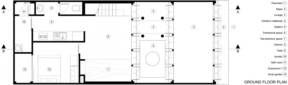 茶室是根据民宿主人的喜好来设计的。所有门窗都可以大大敞开,让花园中的光线照射进来。大自然本身总是带着一种永恒的美。受到自然的启发,花园也采用了简单的材料和颜色,以最自然的方式被打造。能够在城市中心与自然融为一体,让人感到格外的平静悠然。