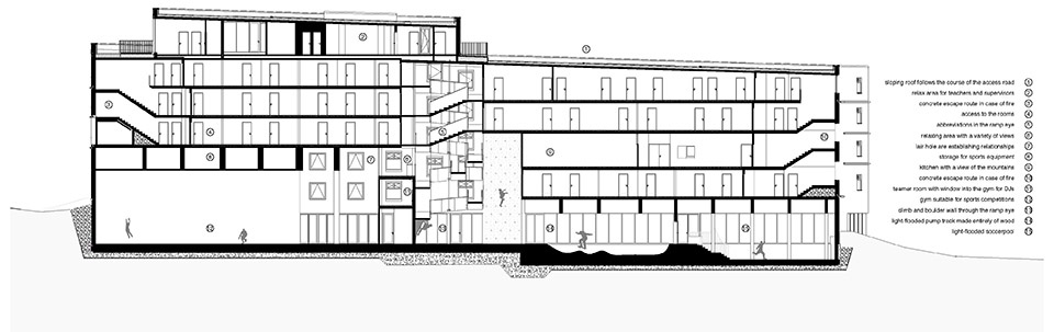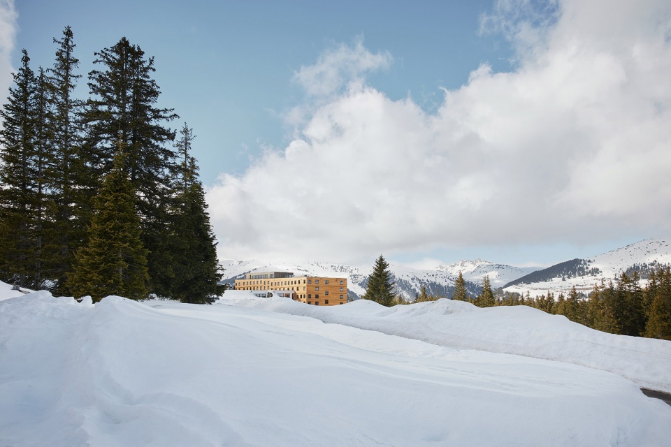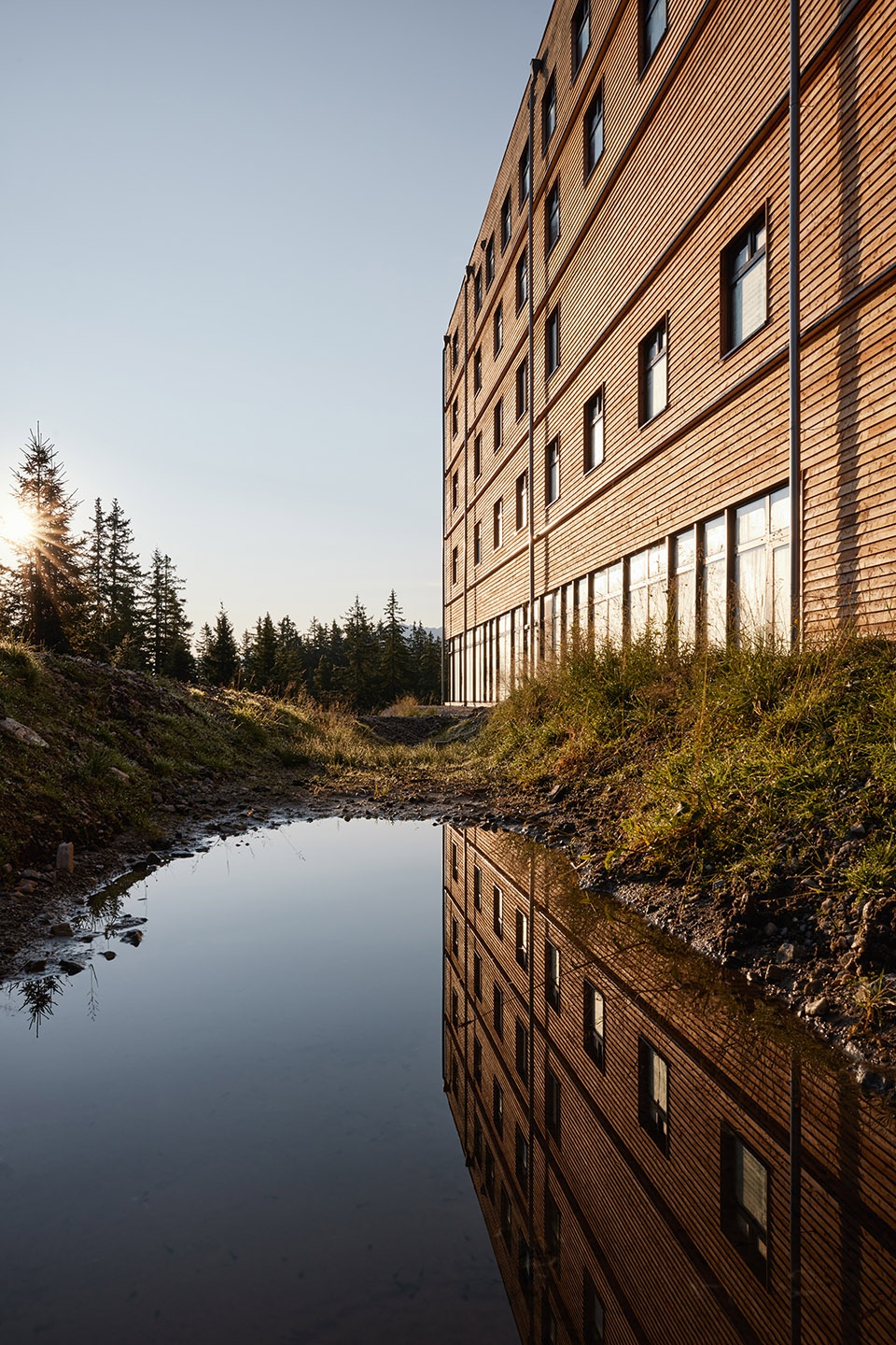 Gerlos青年旅舍位于奥地利阿尔卑斯山海拔1700米的Hochkrimml村。滑雪运动在奥地利社会文化中根深蒂固,也是学校教学的一部分。本项目旨在为学校的滑雪旅行提供更为生态的环境与更为实惠的住宿地点。因此,青年旅舍采用了当地生产的实木建造,并由当地生物质集中供热设备统一供暖,建筑的主要电能来源则是光伏发电。来此住宿的青年们也不是乘坐个人交通工具,而是主要靠长途汽车前来。此外,项目中交叉层压木墙运输过程中剩下的木材还被加工成家具,进一步减少了材料的浪费。
