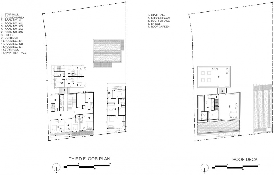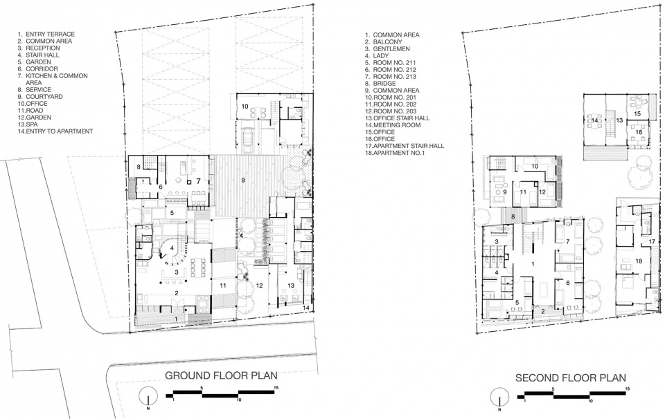 原本的22个既有单位被改造为占地700平方米的旅舍,包含水疗区和一套两居室的私人住宅,总体使用面积为1100平方米。原先的4间店面被拆除,创建了一个新的中心庭院,从而带来更好的通风、宽敞的空间和多元的视野。庭院为社区提供了放松的空间,能够让人们在一种平静休闲的氛围中产生互动。