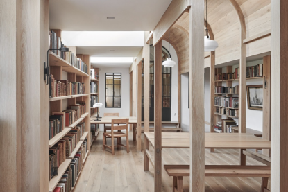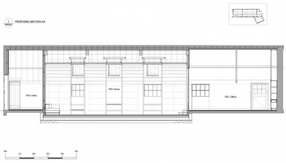 图书馆呈现出中央拱顶以及对称式走廊的古典形式,但是原始结构中采用的传统农场木工、金属材料与施工工艺,却在建筑的新旧用途之间建立起一定的联系。改造方案仅仅涉及到两座原始木桁架的拆除,拆除的桁架如今已被层压木框架结构所取代,全新的结构除了起到加固外墙的作用外,同时还形成了隧道式的中央拱顶走廊。中央空间的一侧,连续的木制拱顶被三处天窗打断,这种设置为书架以及阅读空间提供了充足的自然光线。图书馆的部分地面采用了下沉的形式,这些下沉空间比其余室内空间低两英尺(约60厘米)。