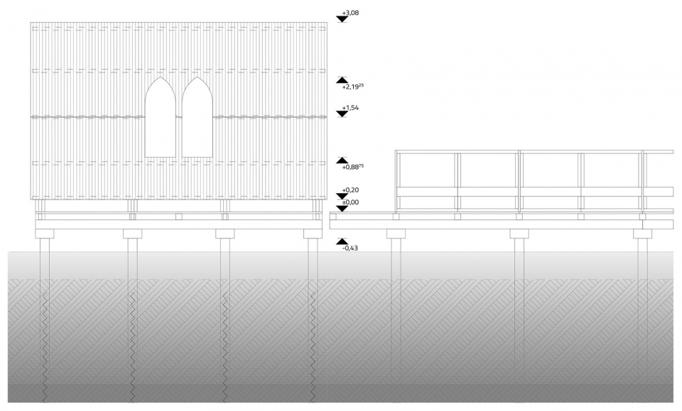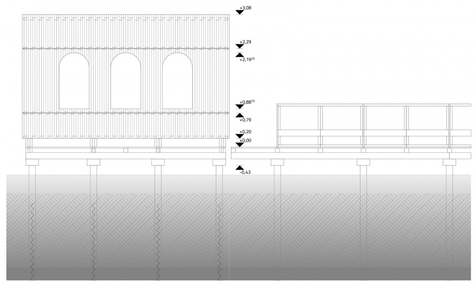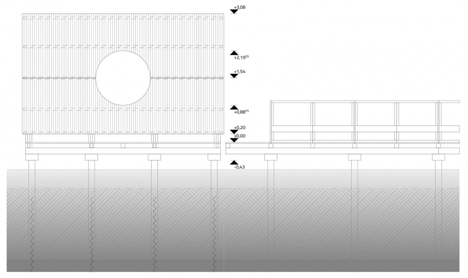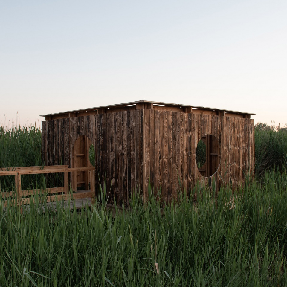 设计师希望以一种有组织的方式,用富有趣味性的几何构图来延续这种品质。通往自然保护区的教育步道被定义成一条长500米,半径也为500米的弯曲路径;沿着步道设有一系列供人们观察自然的建筑结构,包括:一座水牛谷仓、三个通过窗口欣赏景观的小装置,以及步道尽头的观景台。