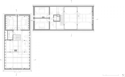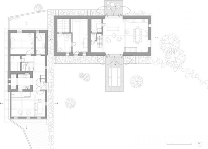 马厩为辅助用房,其中设有避暑客厅和客房,建筑师对其进行了较多介入,空间的整体氛围更为明亮开放。原本的石墙被混凝土墙面取代,其后藏有楼梯间和桑拿房。上方的室内墙面全部被涂成白色,以突显原本的木制屋架。主要的起居空间通过玻璃折叠门与室外露台相连,人们还可以通过一面巨大的固定窗欣赏草原上古老的树木。空间的核心是一个开放壁炉,由附近山中采到的巨大石块制成