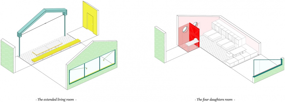 房屋的主人希望对建筑进行扩建,使其适应半农村半城市的居住状况。既有建筑原本是一栋建于70年代的避暑小屋,建造过程中没有使用任何保温材料,也没有与周围环境构成直接的联系。基于这些问题,设计师提出了一个具有三重意义的策略,试图逐步为房屋置入保温层,在提高舒适性的同时减少房屋能耗,并将其既有的乡村特色凸显出来。在已经完工的一期工程中,房屋外围增建了3个新的体量,并通过陶瓷材质的饰面与旧的体量进行区分。这三个新的体量分别包含了扩大后的起居空间、供四个女儿居住的卧室(原先是车库和柴棚)以及一间锅炉房。