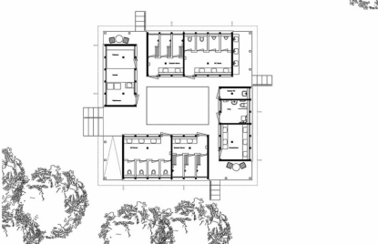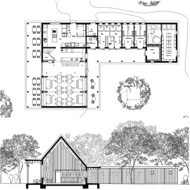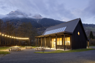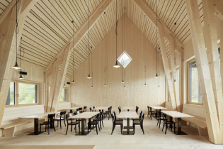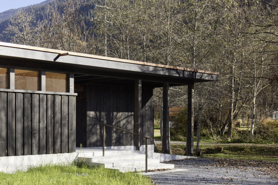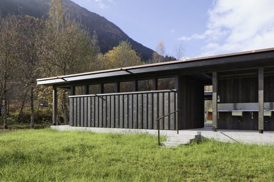 Huonder设计的Trun野营地由两个木制建筑物组成:主体建筑物包含前台和餐厅功能,另一个是澡堂“Prau Lung”。主体建筑物位于“Prau America”的最高点。地点选取考虑了天际线、视觉集中点和平衡点的因素。类似于传统地方木制建筑,餐厅位于森林里的第一片空地,也就是营地北部,后面还有一片池塘。遮雨棚和建筑本体组成营地中心,朝向西南方太阳落下的地方就是主入口和餐厅的所在。
