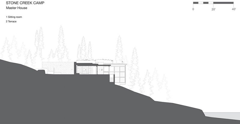 该营地坐落在一处偏远的山坡上,指引着游客逐步接近和发现场地。从门楼开始,一条路径连接了位于下方的主人住宅、林间小屋和旅馆。