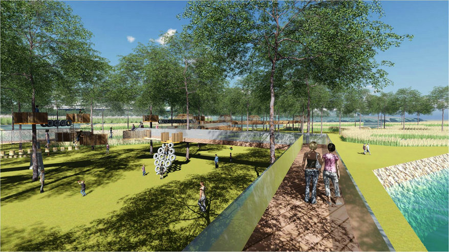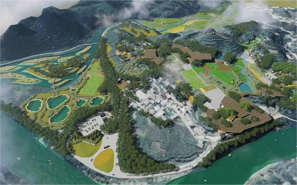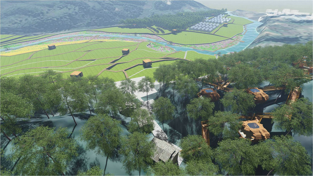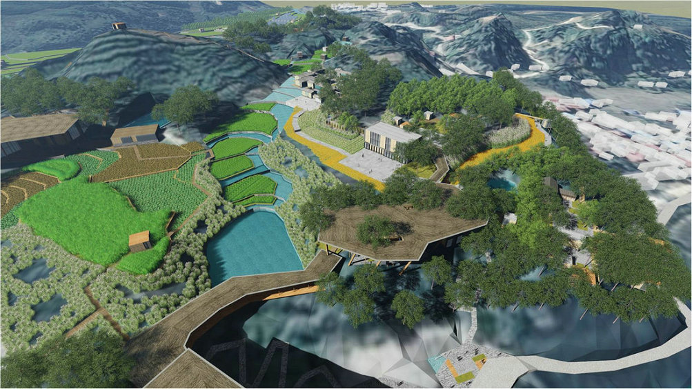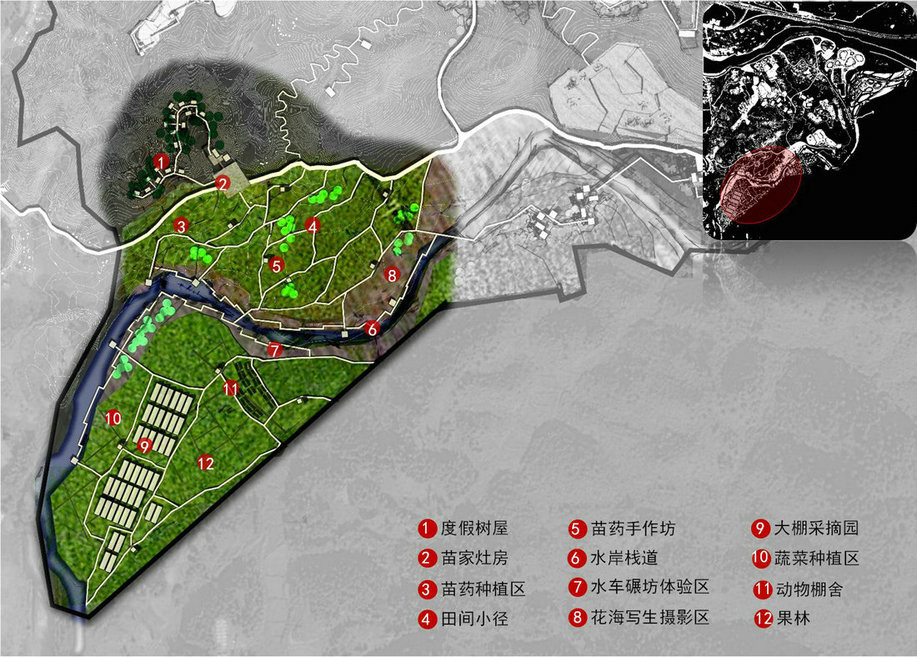 度假休闲区在南侧,是比较独立的区域,在现状农田的基础上,将种植区分割成不同的区域,栽植多种农作物和苗药,发展绿色种植业、生态养殖业、和传统苗药产业,打造生态农场,体验田园度假氛围。利用山坡南侧的现状树,设置度假树屋,并结合苗家灶房打造高端度假餐饮体验。