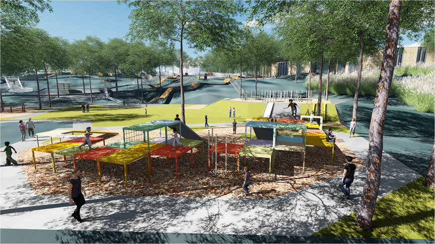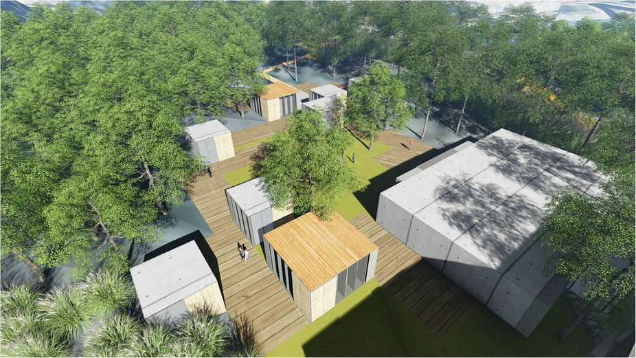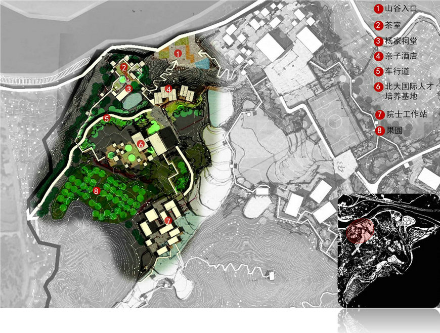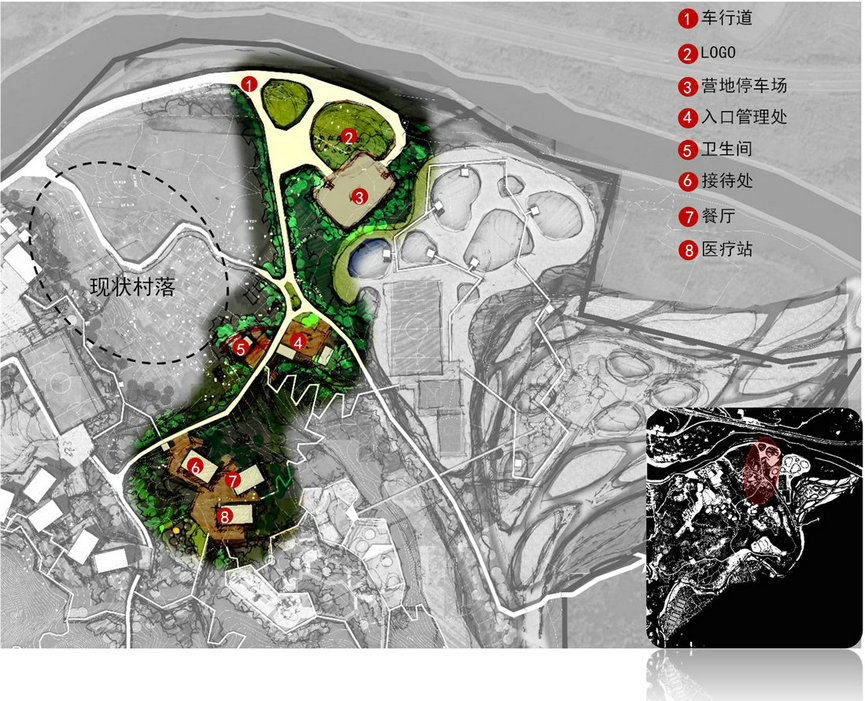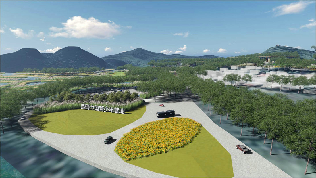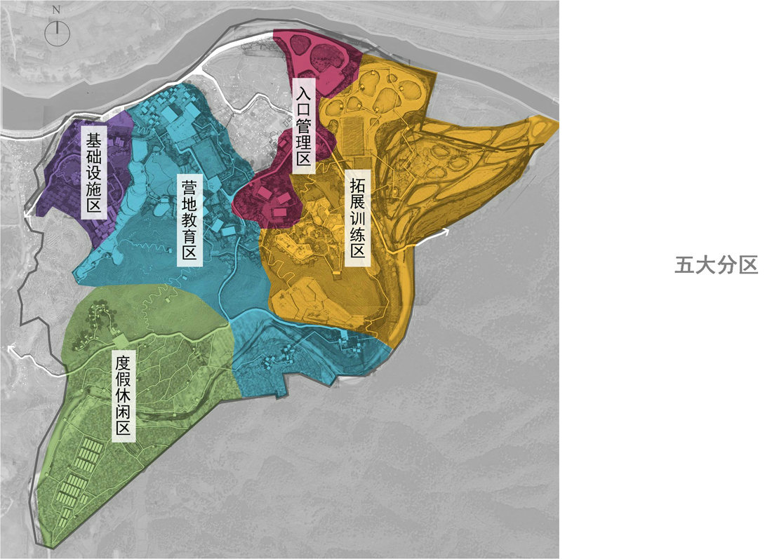 基础设施区位于西侧,与营地其他区域通过现状山谷分隔开,有独立的出入口和车行道,在功能和交通上互不干扰,是提供营地教育,基础服务的集中场所。