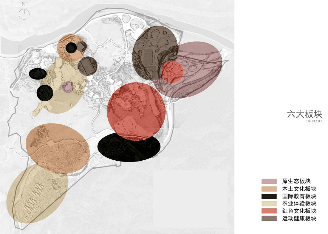 营地教育区主要由宿舍、食堂、民俗文化体验街、模拟联合国、农耕体验区、梵梵净净动漫营等部分组成,是学生集体训练的场地。区域中能提供1000人的食宿需要,进行开闭营仪式、集中训练、农业劳动、文艺表演和各类专业课程的学习都可以在这里完成。民俗文化体验街由多个小体量建筑组合形成,有利于顺应山地地势,形成一个个小尺度的院落空间,营造书院式的学院氛围。