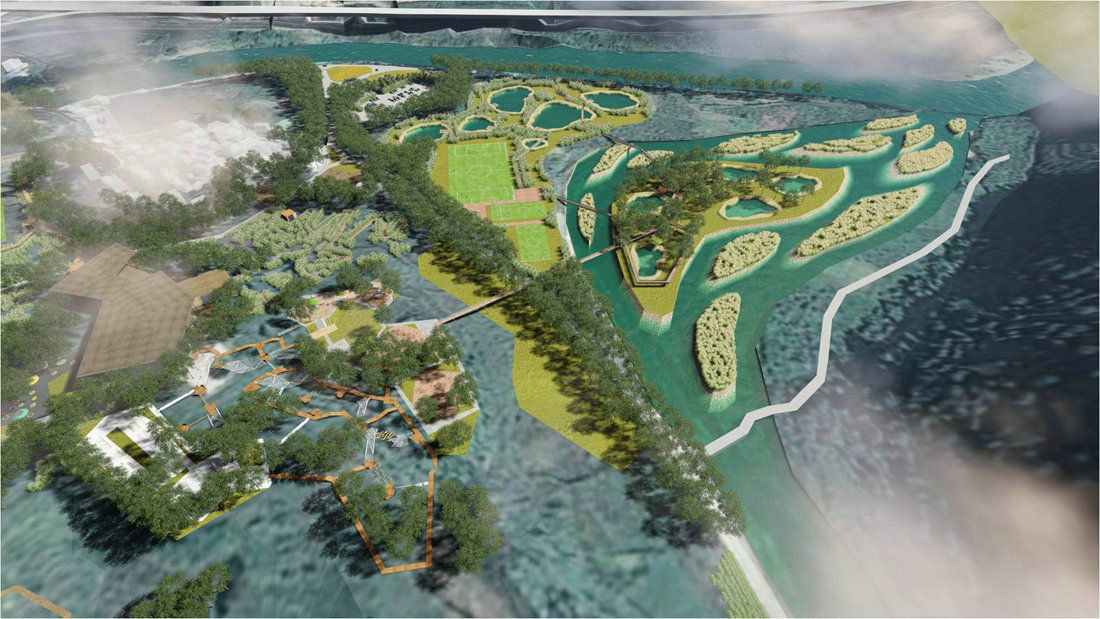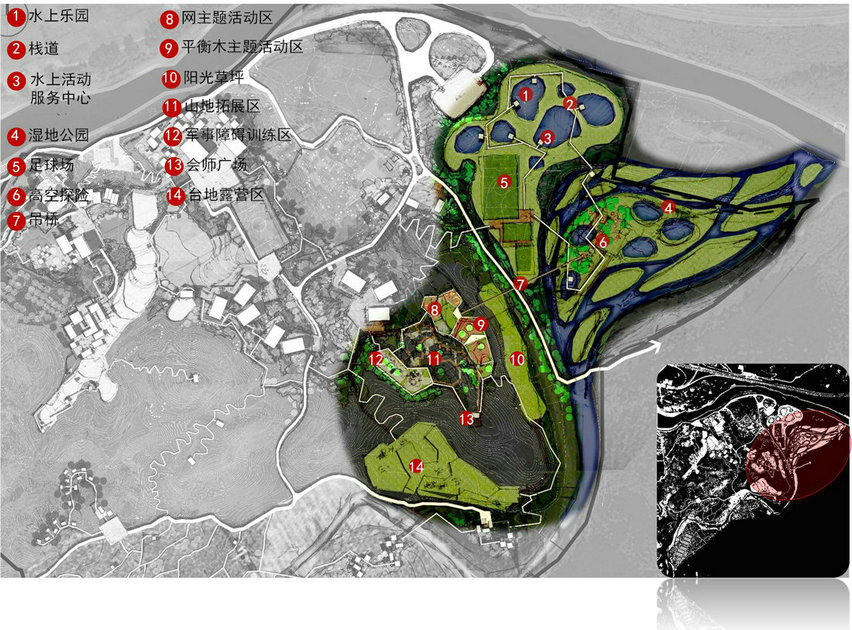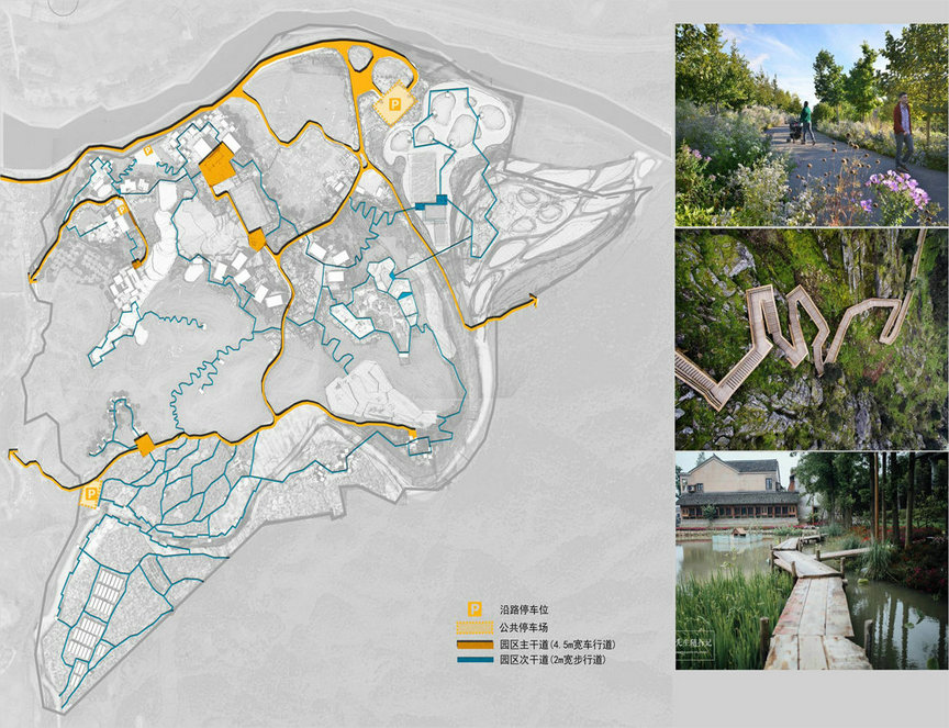 内部步行道采用环路设计,包括漫步道,登山步道和水边栈道,联系各个功能区和建筑组团,提供多种游览方式的选择