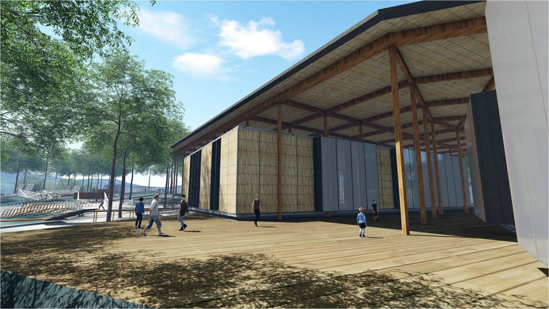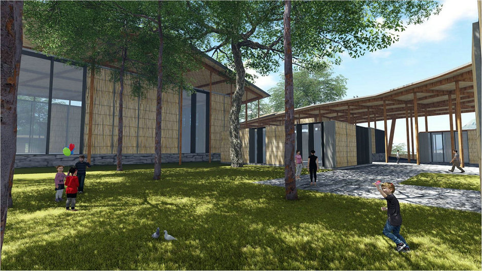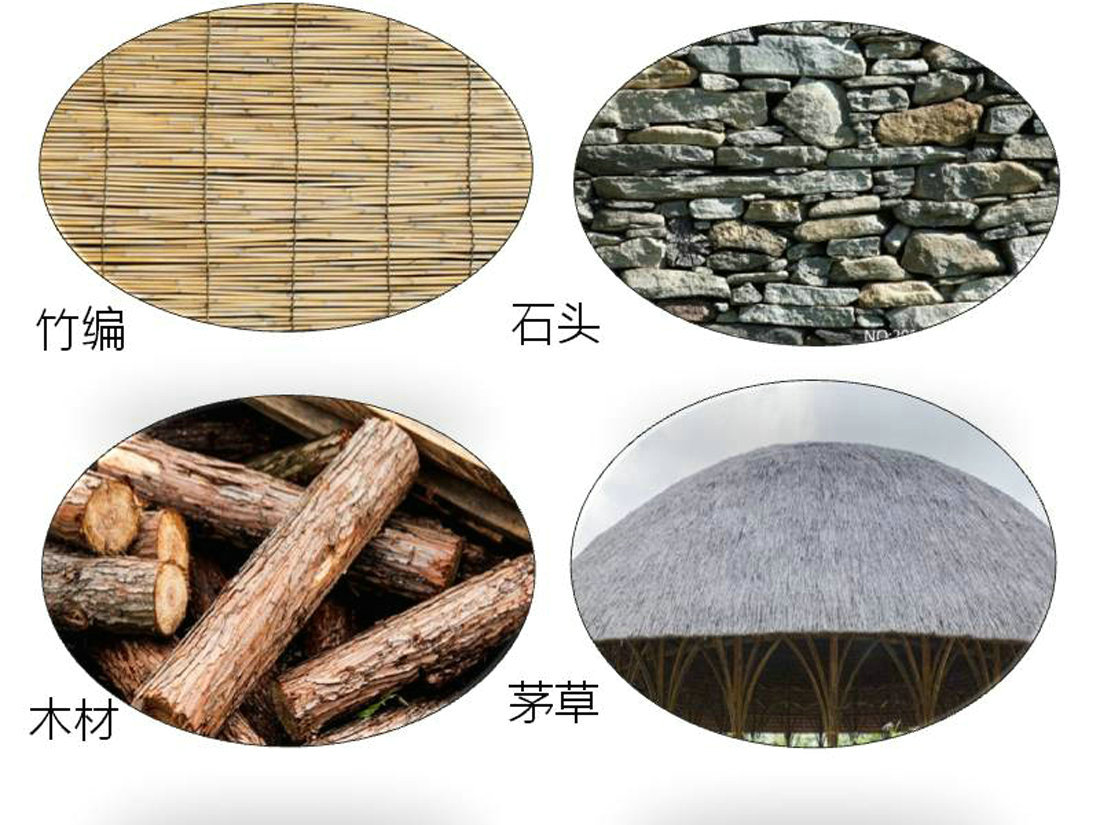 石头从山中就地取材,作为建筑基础。当地盛产竹,使用竹编工艺作为建筑立面,使之更具有当地特色。木材具有韧性强、灵活易组装的优点,被用于建筑的支撑结构。天然材料的选用使建筑能够回归土地,从而形成源于土地的生态建筑。