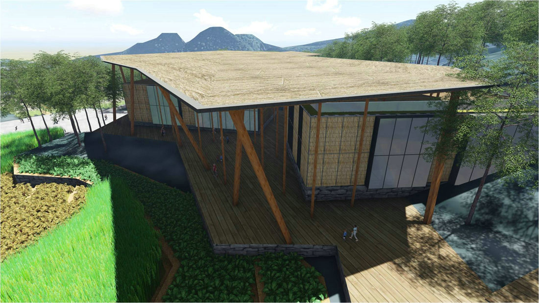 所有建筑呈传统的院落式布局,顺应山地地形而建,每个单独的建筑单元之间通过通道联系,提供一个可灵活利用的文化展示长廊。展示了如何使用当地材料、传统布局形式、绿化屋顶等概念。同时,通过顶棚局部开洞增强了内部的采光和通风条件,并为雨水收集提供通道。