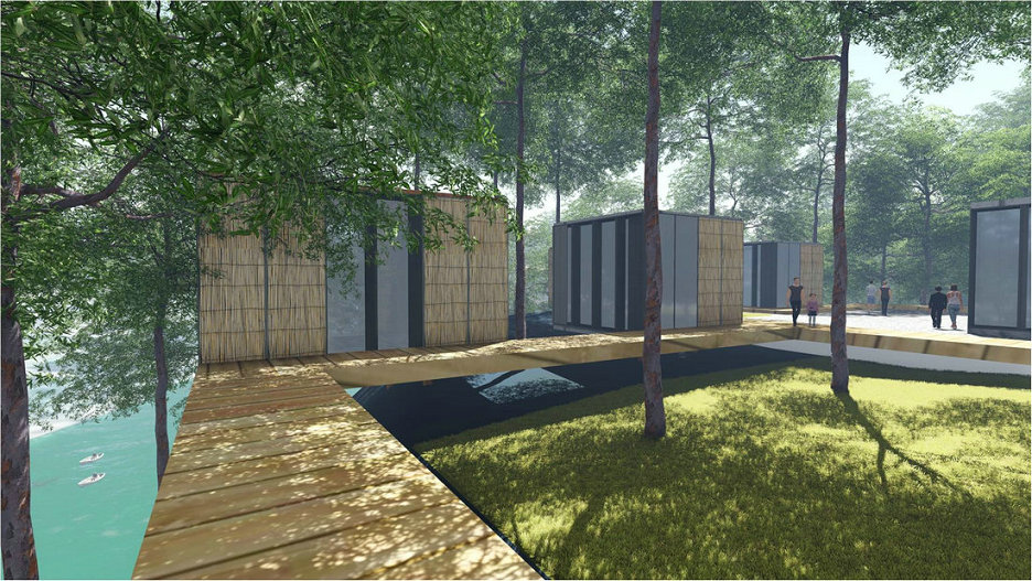 一个营地的运营与发展,管理很重要,入口管理区在场地北侧,紧邻一带双核慢行道,设置LOGO进行引导