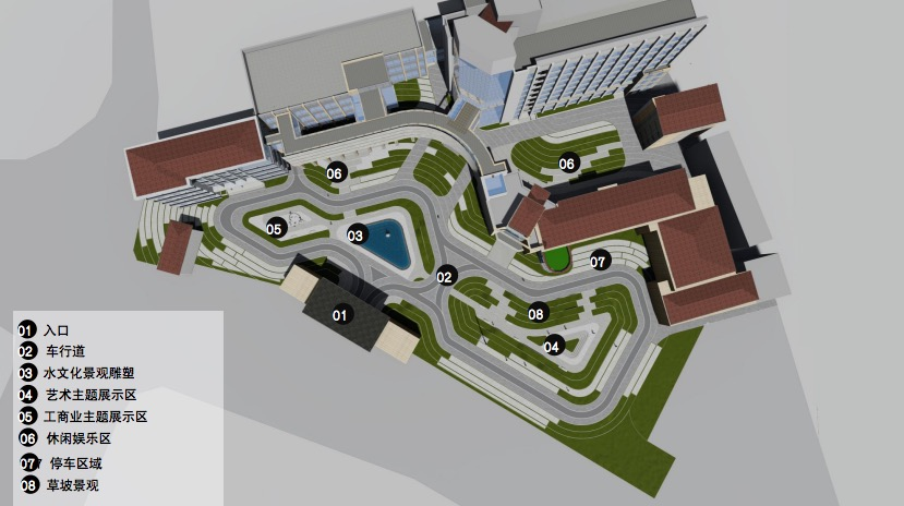 此外,艺术文化主题展区有雕刻字体形式的文化刻印 。将文化融入景观、地面、草坡池壁、景墙......都可以成为文化刻印的载体,将当地文化以一种更为低调和深刻的方式融入景观,参与到公众的活动中。同时,艺术文化展区还有文化长廊。文化长廊是一个没有边界的文化设施。通过文化长廊营造一个全天候的半户外文化空间,能方便到达各大场馆,同时也能自如出入在自然界面中,塑造多元的文化设施与多样的休闲配套。文化长廊如下图所示: