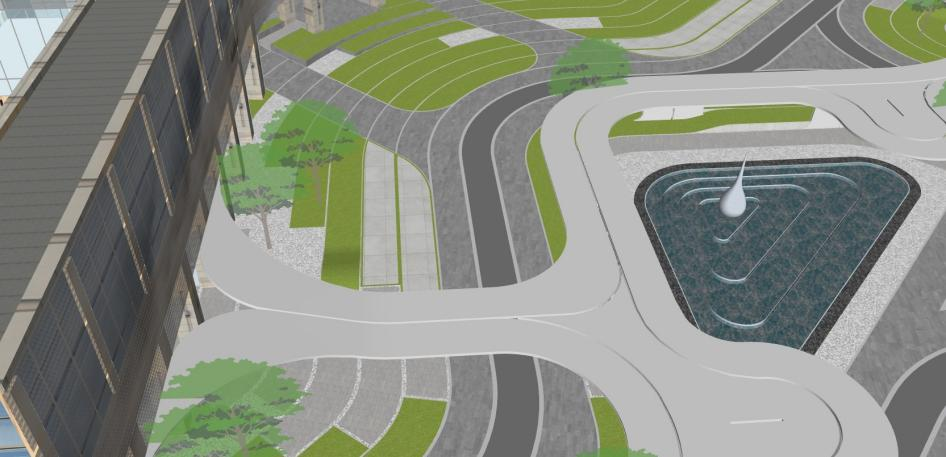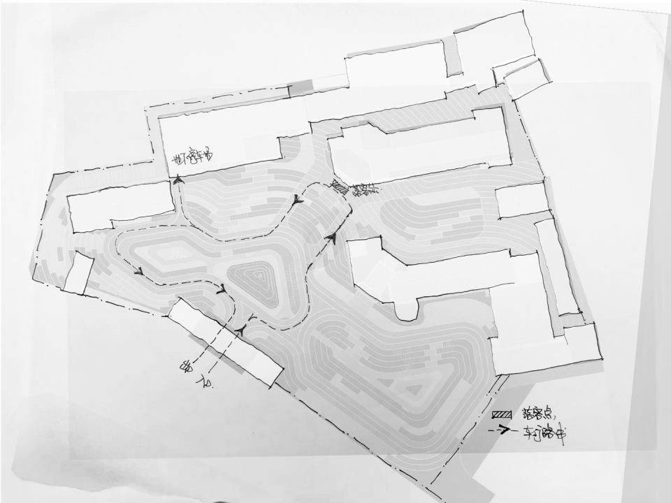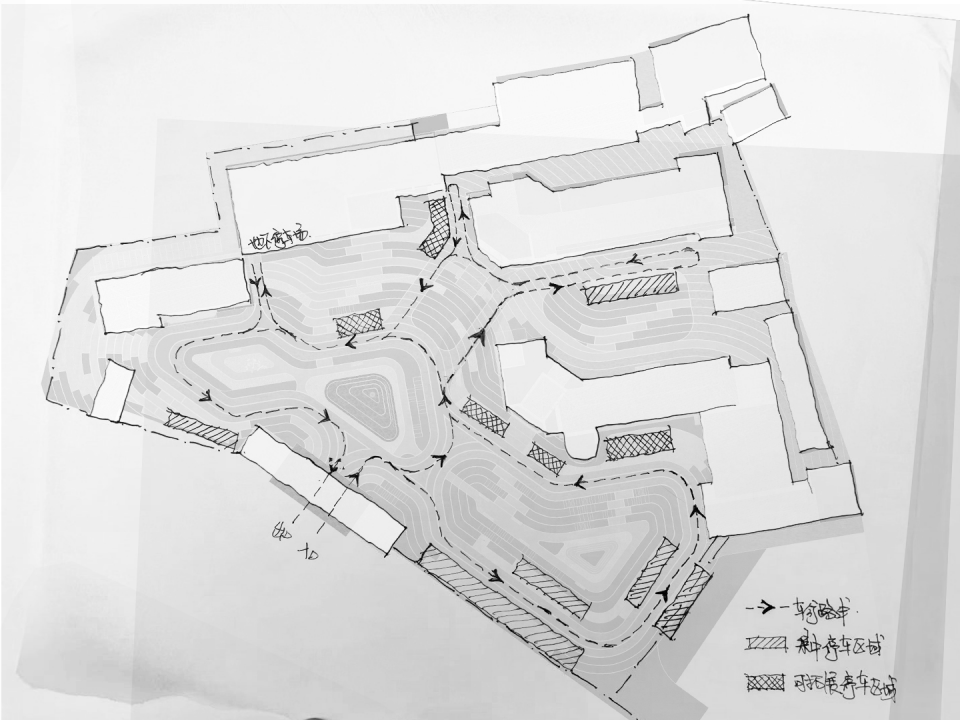 在本次场地设计中,车行路大部分设计为单行路,道路中心线可以用标识进行指引。停车区域主要集中在 场地东南侧,也是现状的停车区域。场地内留有一些可以拓展的停车区域,在召开会议时也可以把车停到这些位置。