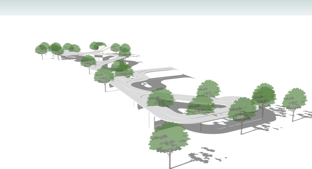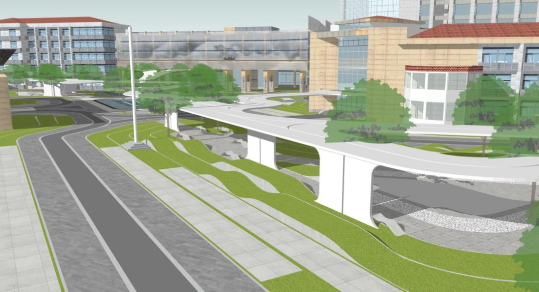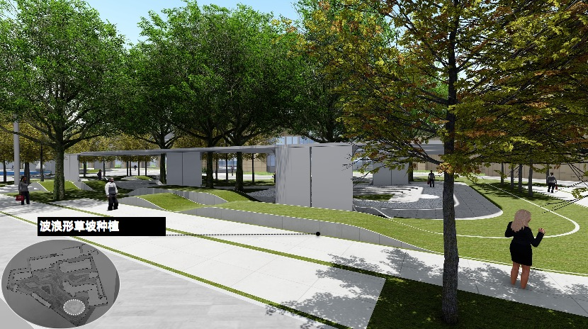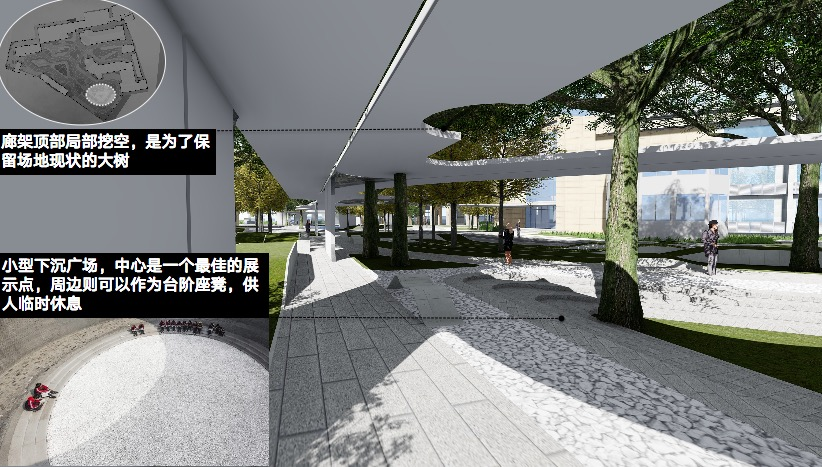艺术文化主题展示区还有廊架和小型下沉广场。廊架底局部底部挖空,是为了保留场地现状的大树,同时廊架中间有一道缝隙,光可以透过缝隙打下来,起到疏散人流的作用,人们可以通过廊架中的缝隙,感受到阳光和光线的变化。此外,对于小型下沉广场而言,下沉广场的中心是最佳的展示点,下沉广场周边可以作为台阶坐凳,供人临时休息。