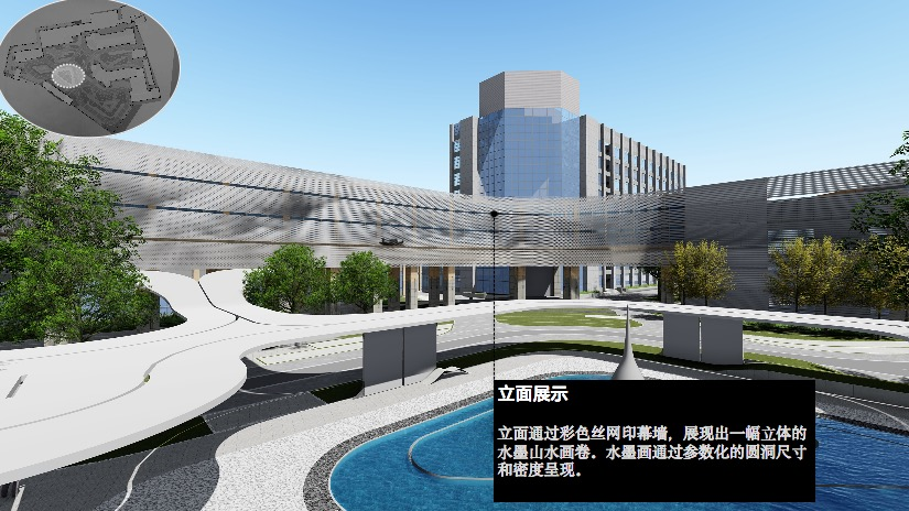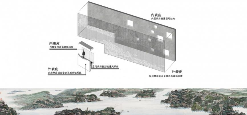 外立面改造是本次设计的亮点所在。外立面通过彩色调整和印幕墙,展现出一幅立体的水墨山水画卷,水墨画通过阐述圆洞尺寸和密度。材质的构成如下图所示: