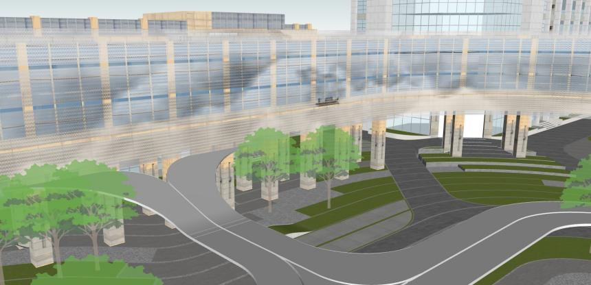 场地现状的绿地集中在东南角,除此之外,广场内少有绿化,夏季缺少遮荫,无法进行交通以外的活动。现状建筑的二层连廊提供了一段适合活动的廊下空间,我们设计了一条新的文化长廊,将他们的顶部连接起来,营造一个全天候的半户外文化空间 。