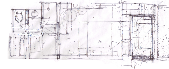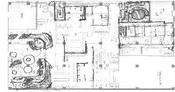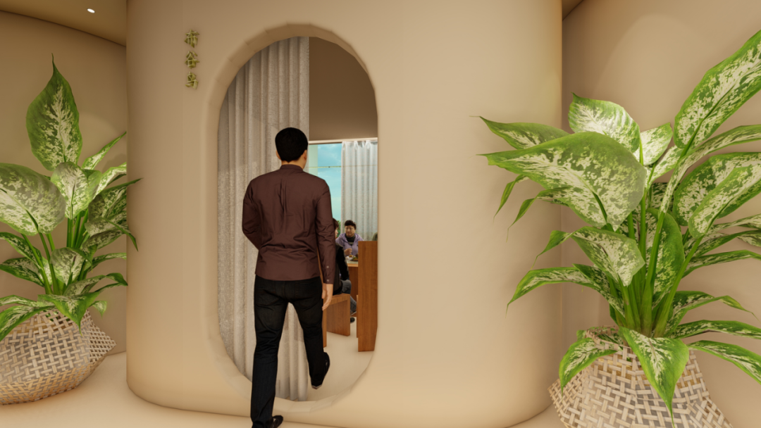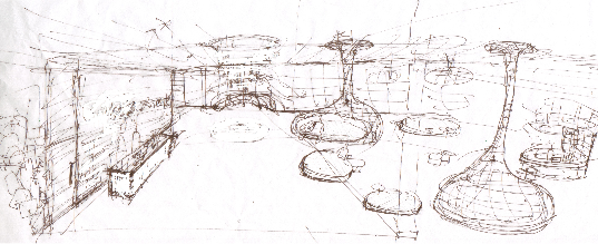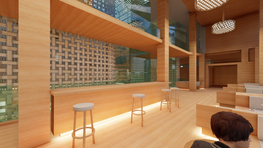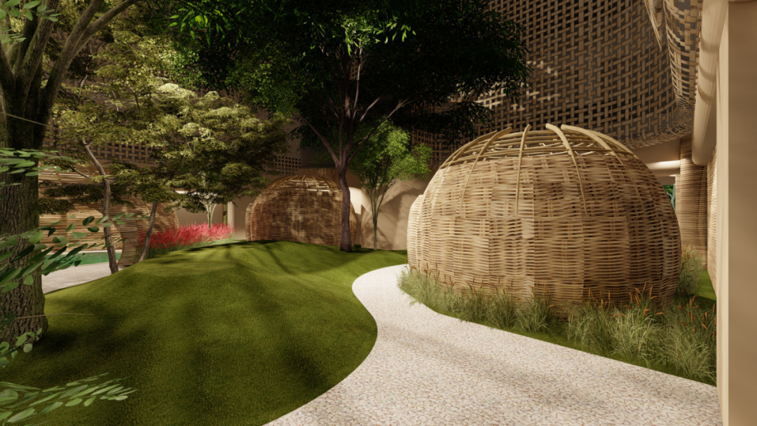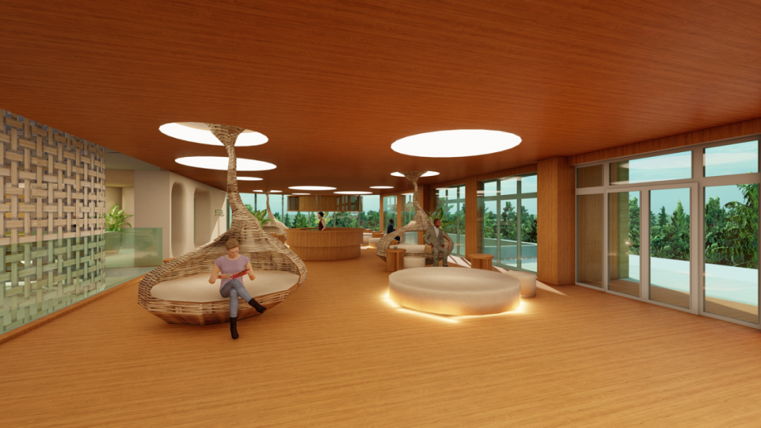 首先,在接待厅公共空间,设计草图如下。大厅采用软垫、配以荆条编织外壳,顶面采用亚克力板照明。大型软垫其中有外加荆条编织外壳,设计成鸟巢椅的形态,供人休息。在接待厅的公共空间,可以体验到鸟巢椅,可以看到玻璃外的室外湿地空间。