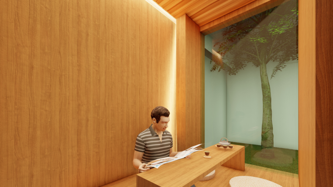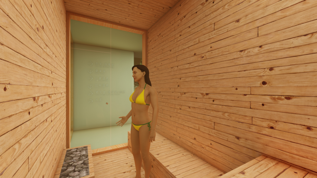负一层还有桑拿房的配置,采用双层阶梯坐凳,内藏隐灯带。同时还有茶室,按摩室的配置,采用空间顶面隐藏式照明,外部日式景观灯展示,茶室内纯木桌 、蒲团盘腿就地而坐。打灯方式为隐藏式灯带。同时在很多房间周围设置了和中庭空间相似的枯山水景观。日本式写意园林的一种最纯净形态,也是日本画的一种形式。