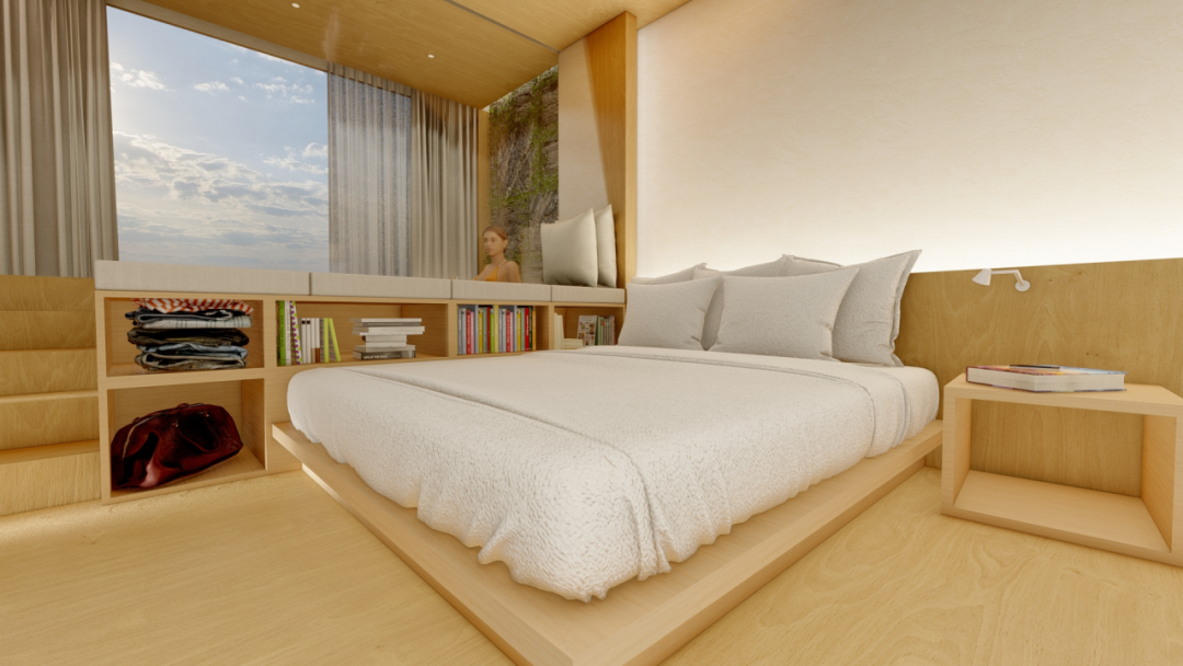标准客房的主要亮点是:1)空间错层:在套房内部设置了一个空间错层,宾客可以通过踏步走上温泉和阳台部分,丰富了空间的高差体验;2)木材石材:空间内设计的元素很统一,用了大量的木材和石材,整体感觉是比较亲近自然的。3)灯光设计:在整个客房内采用隐藏照明,整个光线给人的感觉柔和舒适。
