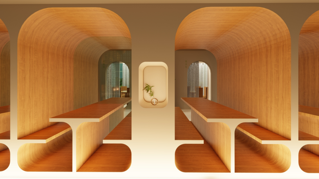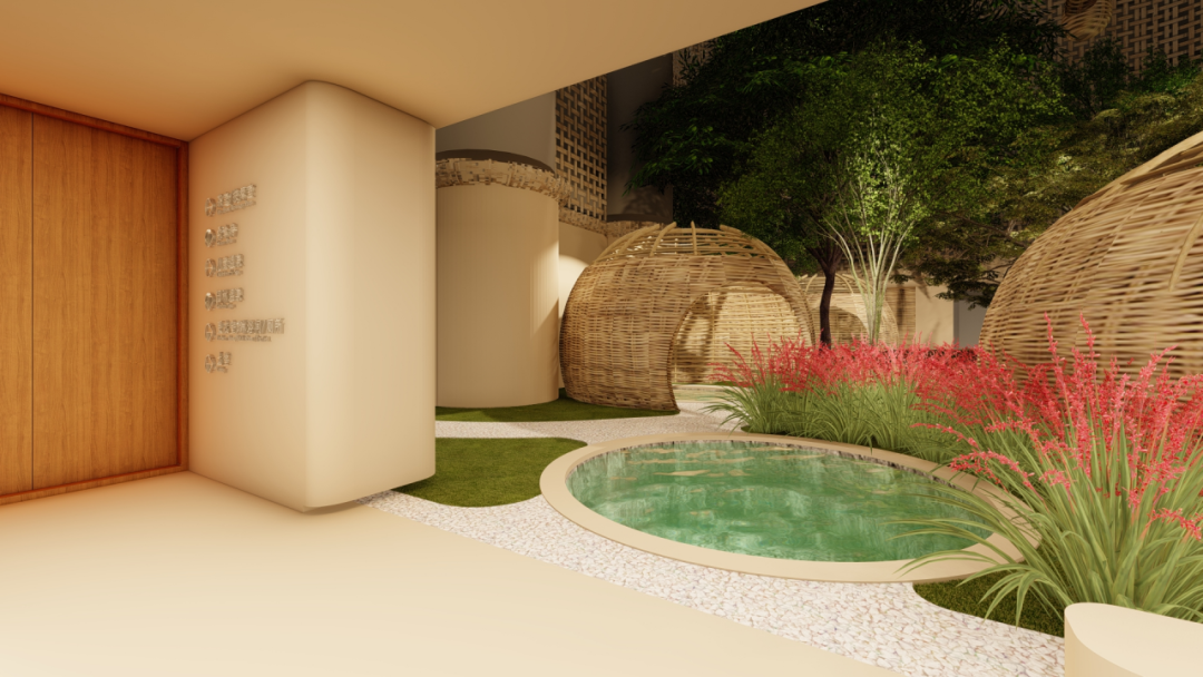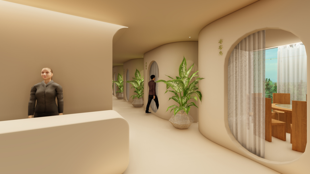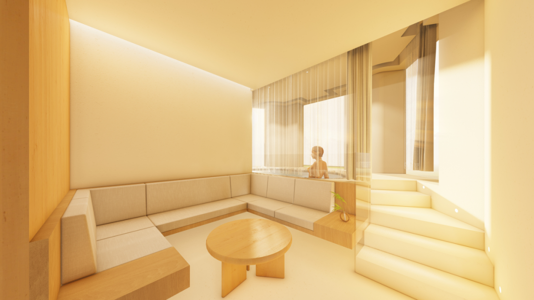 地下一层的中庭空间是本次设计的亮点,泡池外配置日式景观,形成中庭景观,用枯山水围合绿岛空间,再用麻布软垫。暖色微水泥配合光线打造极简空间。温泉采用了半围合无遮挡的温泉和有鸟巢构筑物遮挡的私密性温泉。在半围合无遮挡的温泉中,宾客可以直接触碰到毛茸茸的芦苇等湿地植物,也可以享受到中庭通高空间的敞亮豁达的空间体验;在有鸟巢构筑物遮挡的温泉中,私密性很好,宾客可以摆脱泳衣的束缚,真正地享受那柔软顺滑的温泉之水。
