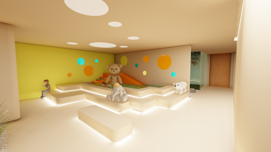 地下一层还有儿童泡池空间,专门为儿童设计,阶梯式扩大空间,色彩明亮。同时下藏饮式灯带,配合玩偶打造儿童温泉空间,让孩子拥有愉快的温泉体验 。