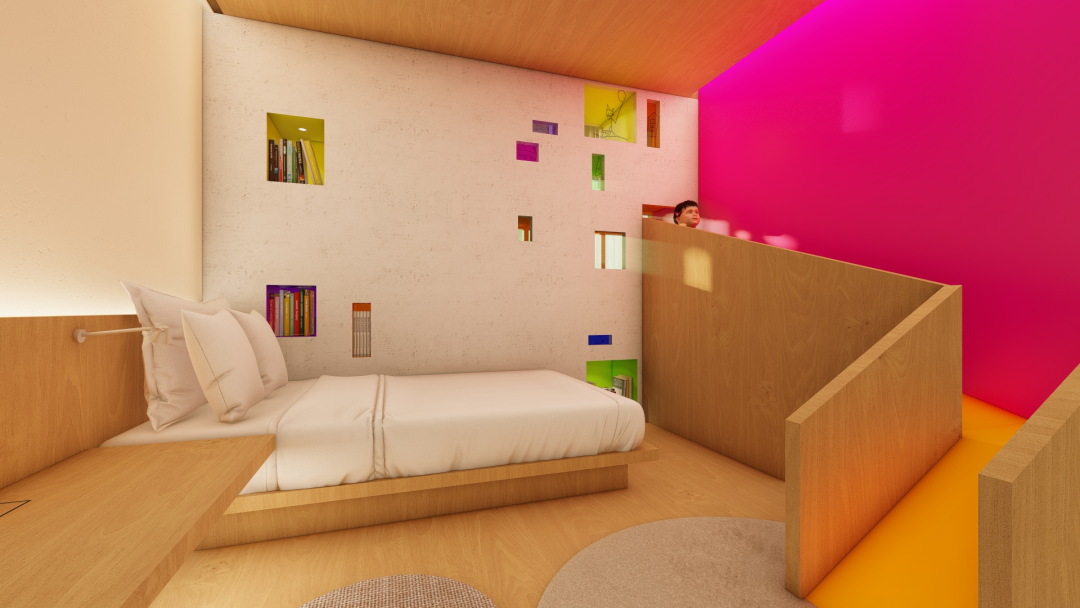 家庭房型主要亮点是:1)空间划分:家庭房型空间通高比较高,对室内空间进行了划分,将泡池区、客厅、卧室都结合高差区分的很明确;2)木材石材:空间内设计的元素很统一,用了大量的木材和石材,整体感觉是比较亲近自然的。3)灯光设计:在整个客房内采用隐藏照明,整个光线给人的感觉柔和舒适。4)儿童区:家庭房型主要是设计了儿童区,设计了很多不同的色块,颜色丰富,儿童娱乐区做成洞穴式坡道,直接通过滑梯进入卧室,采用彩色玻璃采光,光透过彩色玻璃,卧室内会呈现彩色光照,趣味十足。