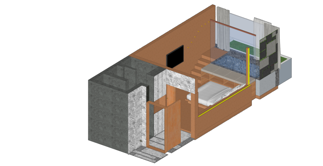 在温泉酒店的设计中,第三大设计亮点就是体现在客房住宿体验上。我们在这次酒店客房中,设计了三种客房:一种标准客房、两种家庭房型空间。设计的亮点主要集中在: