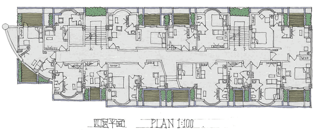 人的居住不该与自然隔离,将原本直走廊做有趣的变化,将光、风、植被引入居所,体会被自然环绕的入住舒适感