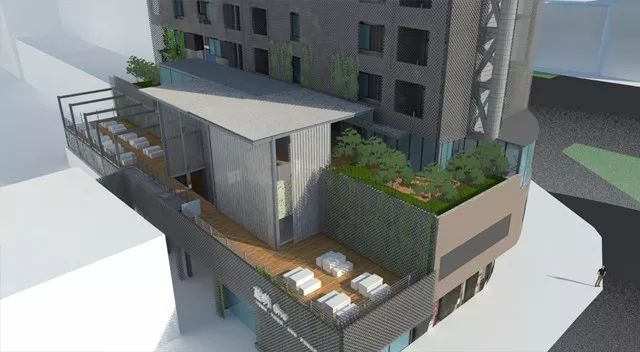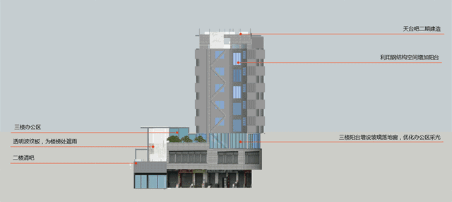 种植池栽植的爬藤植物会随着钢架及丝网攀爬,最终包围整栋大楼的将是一片生机盎然,使用大楼的人们将会在绿色自然中工作生活,好不惬意