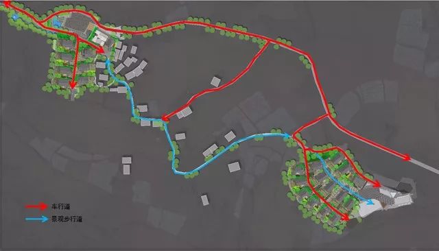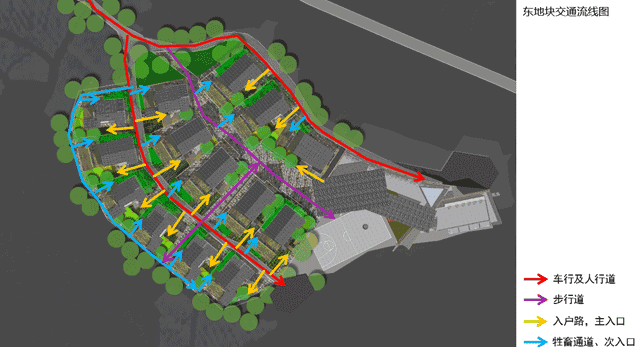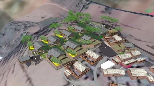 为方便出行,此地块规划有人行及车行路,方便每户居民都能开车入户,由于当地家家养牲畜,有放牧风俗,遂设置牲畜通道,村落内人畜通道分离,利于保持村落整体卫生,居住功能区和公共活动区采取分离设置,不影响居民日常生活,公共活动区有下沉广场、瞭望亭、回车场打谷场等,满足村子的功能需求