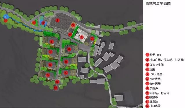 项目的西侧地块,红线面积6371㎡,整体地形为坡地,西北高东南低,共有9户新建民居,其中7户100㎡、1户75㎡、1户65㎡