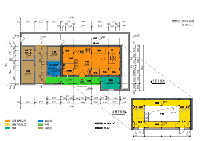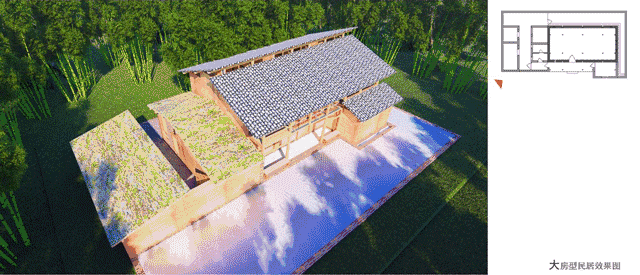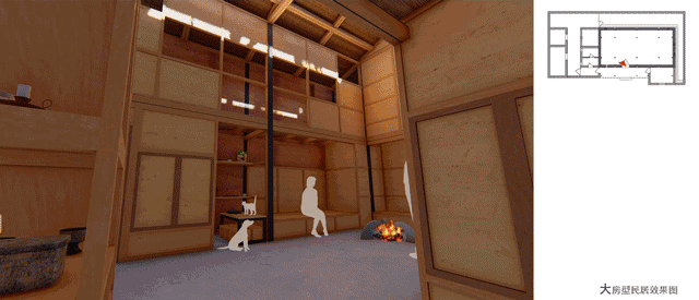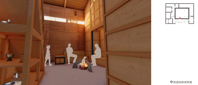 吃住、储物、养殖为当地居民生活的核心,样板布局方案最大限度地保留了这些功能,并将其规整优化。原先以火塘为核心的生活区既要提供吃住功能,又要兼顾会客与平时休闲,免不了走向脏与乱。新方案大厅作为起居和待客空间,上空可由居民自行选择加木构装饰和挂熏肉。将一部分属于厨房的功能从火塘分离形成厨房,大厅火塘提供煮食煮菜和取暖的功能。在大厅周围灵堂方向沿火塘布置起居座椅和客榻,其余地方布置床位、卧室和储物收纳空间。