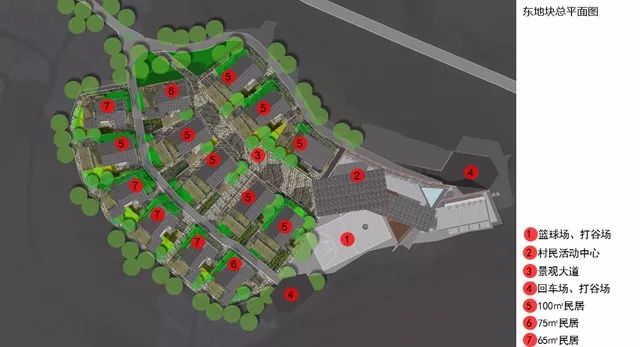 整个项目,有两个地块,面积共14052㎡,共需安置23户民居,其中一户是已建成的示范户,新规划的有14栋100㎡民居、3栋75㎡民居、5栋65㎡民居