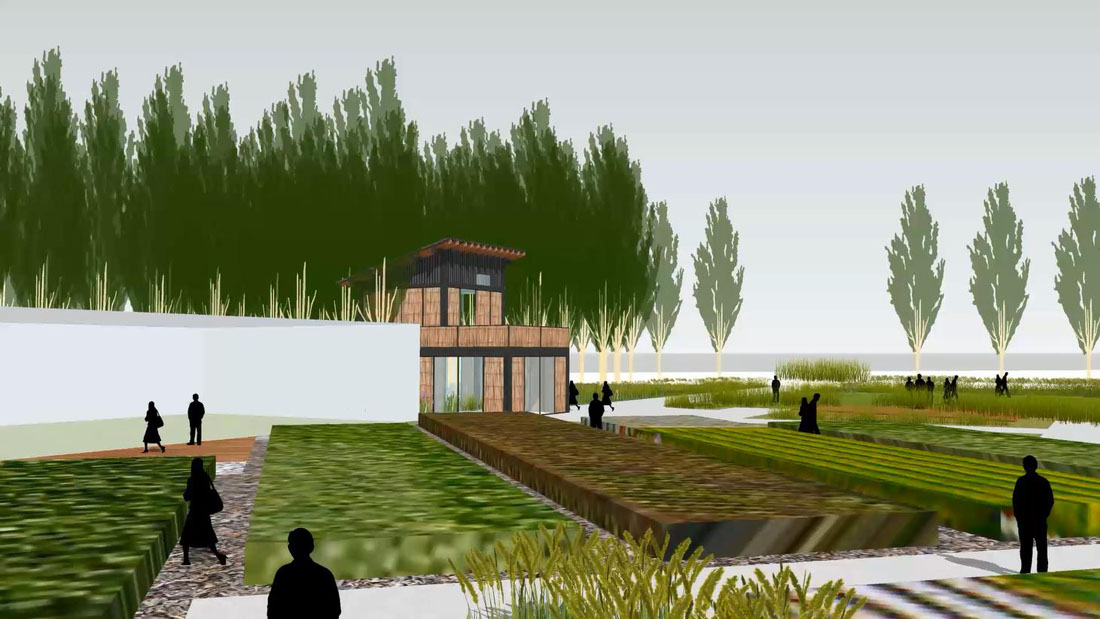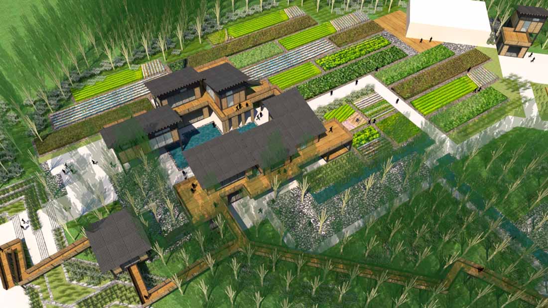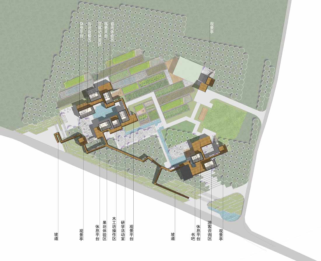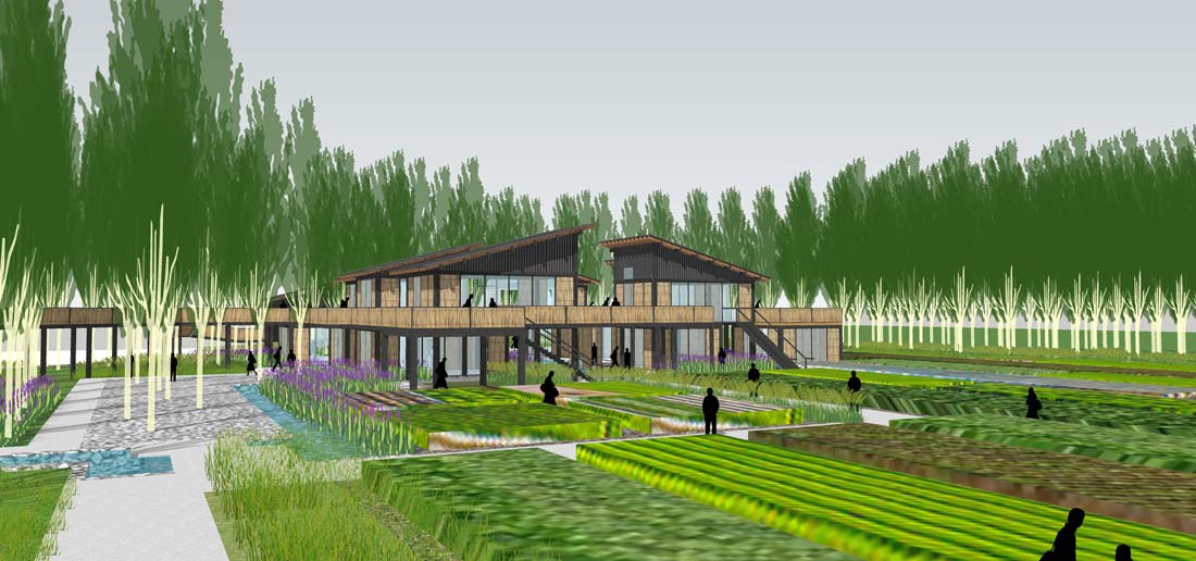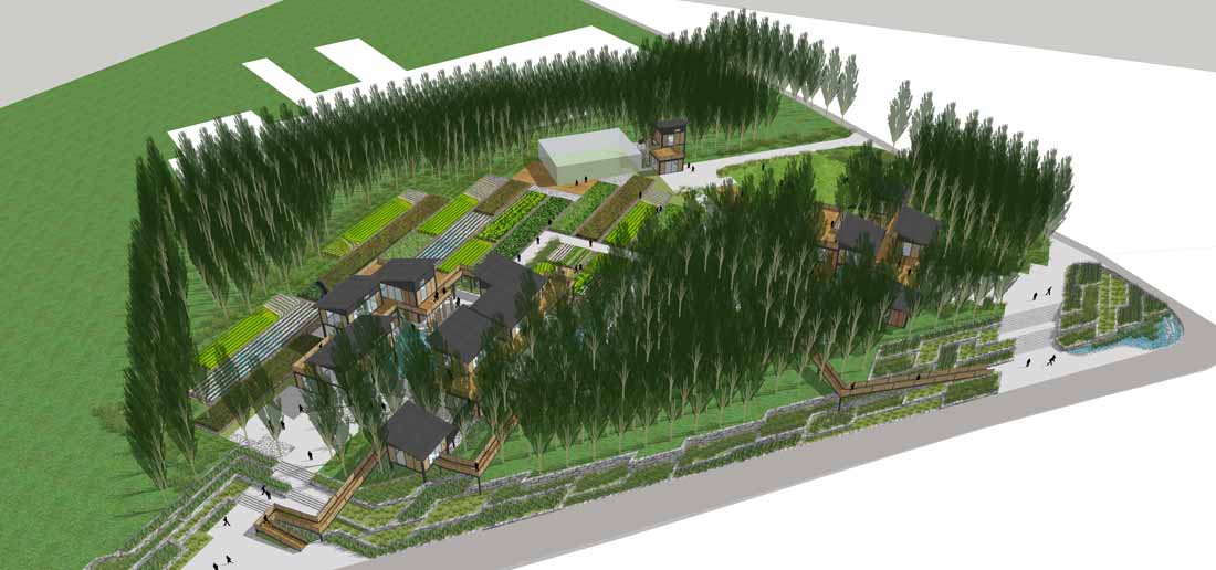 考虑到景区的发展,利用自然以及当地居民楼的优势,我们将杨树林里面的空地开辟改造为一个田园综合体,与周边的农田衔接。这是个集休闲娱乐教育一体的接待中心,同时这也是一个景点:为游客提供认知、体验、购买的服务。