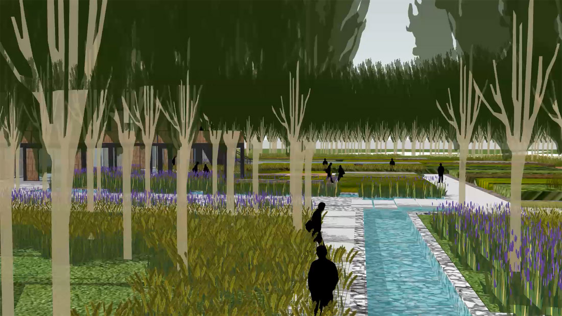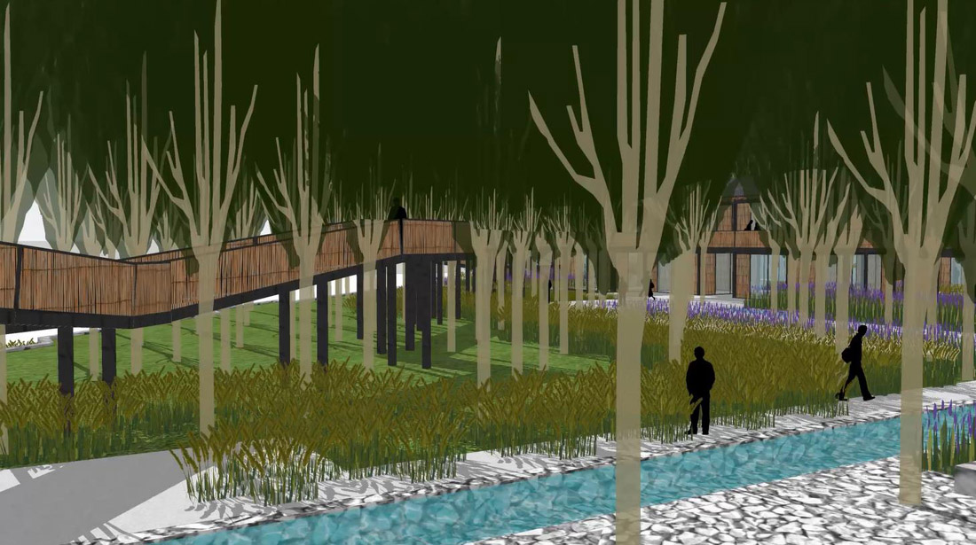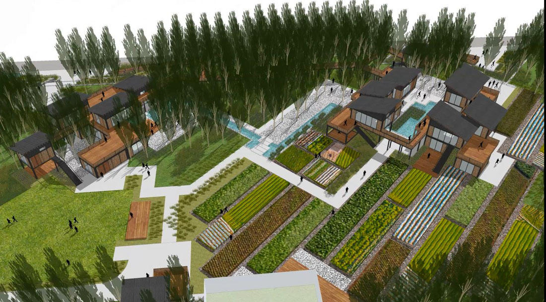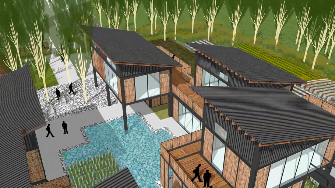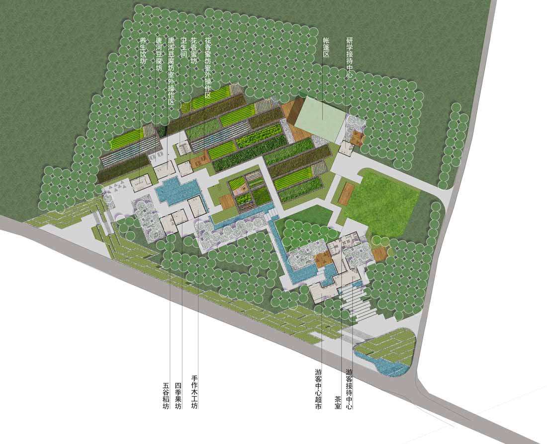 考虑到景区的发展,利用自然以及当地居民楼的优势,我们将杨树林里面的空地开辟改造为一个田园综合体,与周边的农田衔接。这是个集休闲娱乐教育一体的接待中心,同时这也是一个景点:为游客提供认知、体验、购买的服务。