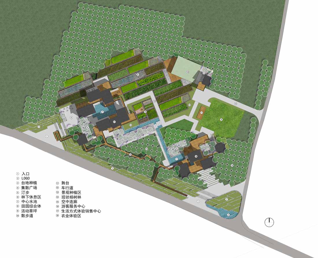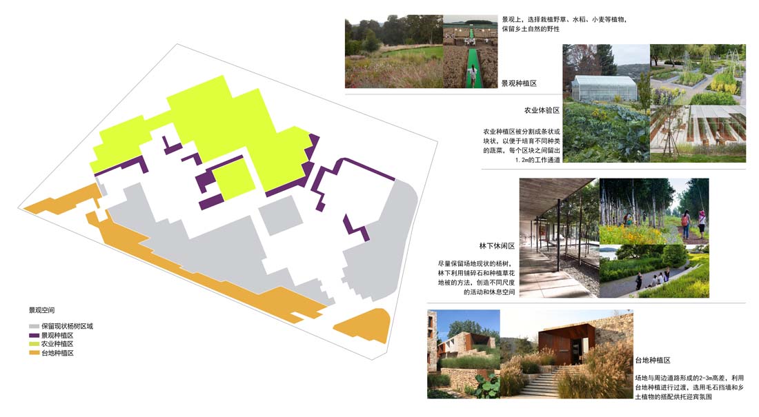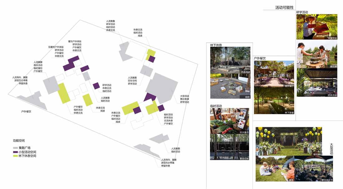 ▽ 根据功能的不同,设计场地划分为以下几个区域:游客服务中心区,田园综合体区,生活方式体验销售区,林下休息区