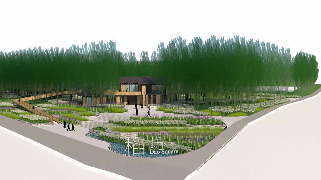 景观上,在保留当地的现状的杨树以外,还加入了野草、水稻、草花、乡土植物等,丰富、柔化景区的景色的同时,也增加了植物的层次感,与远处的山景相辉映。