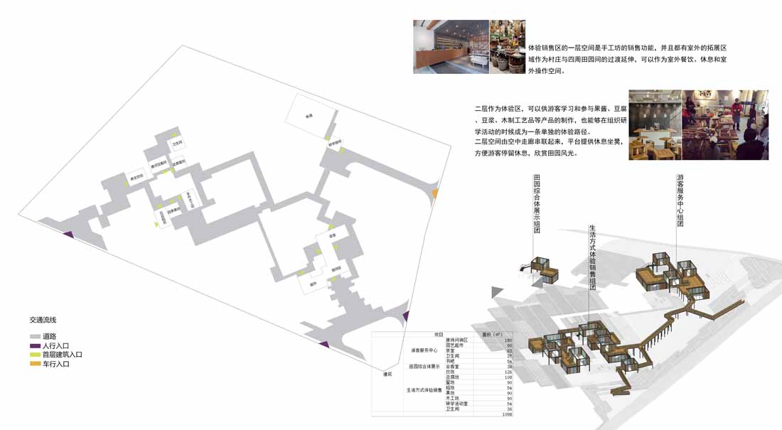 体验销售区的一层空间是手工坊的销售功能,并且都有室外的拓展区域作为村庄和四周田园间的过渡延伸,可以作为室外餐饮、休息。二层作为体验区,可供游客学习和参与果酱、豆腐、豆浆、木制工艺品等产品的制作,也能够在组织研学活动的时候成为一条单独的体验路径。