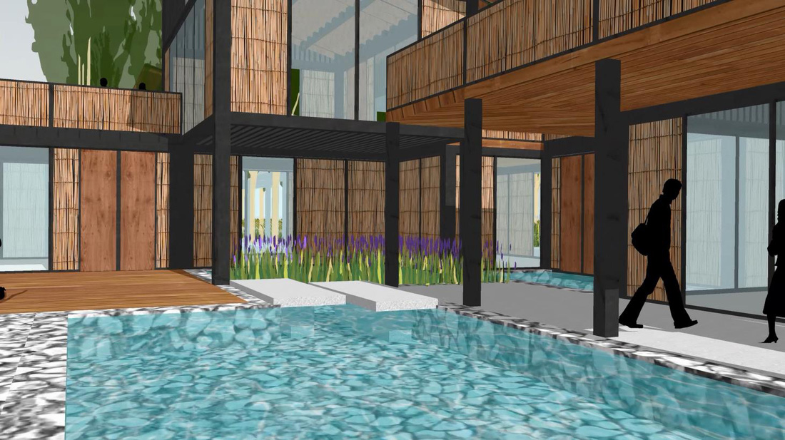 与传统的接待中心不同,WAQI在设计接待中心的时候,采用了集装箱建筑模数来设计的。轻钢结构的组装式建筑,不仅便于运输,造价低于一般的建筑设计,更重要的是在这种设计构想下,建筑材料的选择上会更贴近于自然,环保。让接待中心和周围景观尽可能融合,同时通过树木开枝散叶的理念,周边配上延伸的特色连廊,连接田园综合体展示区和生活方式体验区,让接待中心“消失”在周边景色中,自然而抓人眼球。