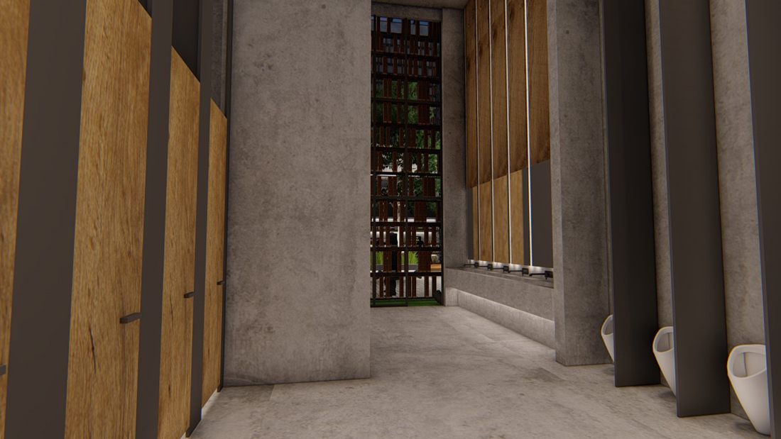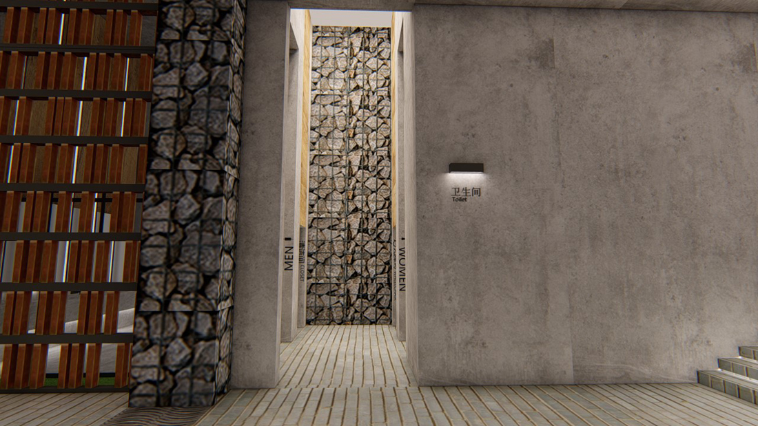 展示中心内设有两处卫生间,较大的一件设有无障碍洗手间和清洁间。中庭的青砖一直延伸到卫生间前厅,以一面石笼墙为背景,顶部整块的长方形光幕暗示空间的转换。