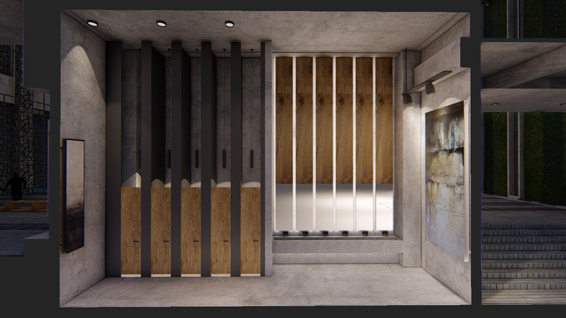 大厅东侧是接待处,一眼看过去,整个内部空间都被灰色的混凝土包围,和入口的石笼墙形成明显的反差,暗示空间的转变。