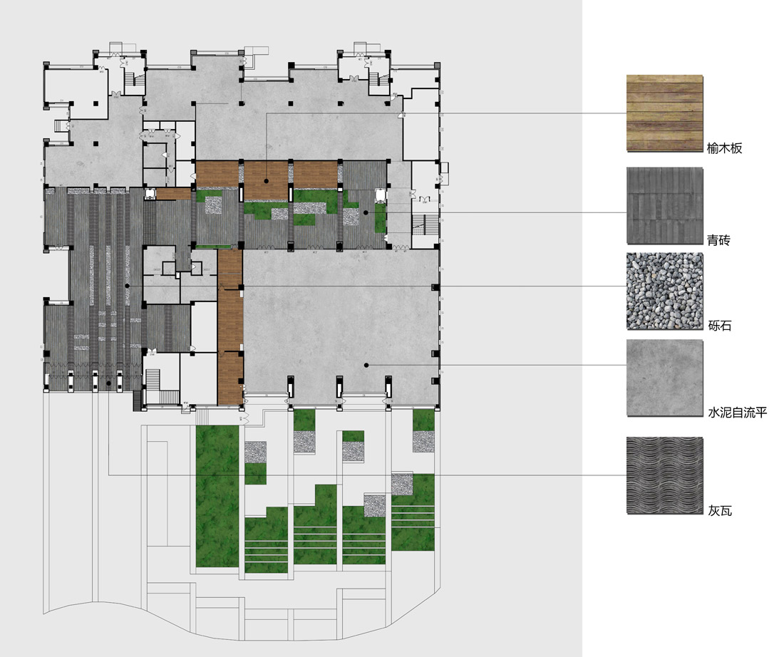 室内选用青砖、灰瓦、素色水泥和自然砾石,力求遵循朴实,自然,简单的原则,与石笼墙都有著一种厚重感,竖铺的砖从室外一直延续到室内,与整个园区的竖向肌理相吻合,用以模糊建筑内外的界限,呈现一种开放的迎宾气氛。
