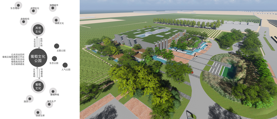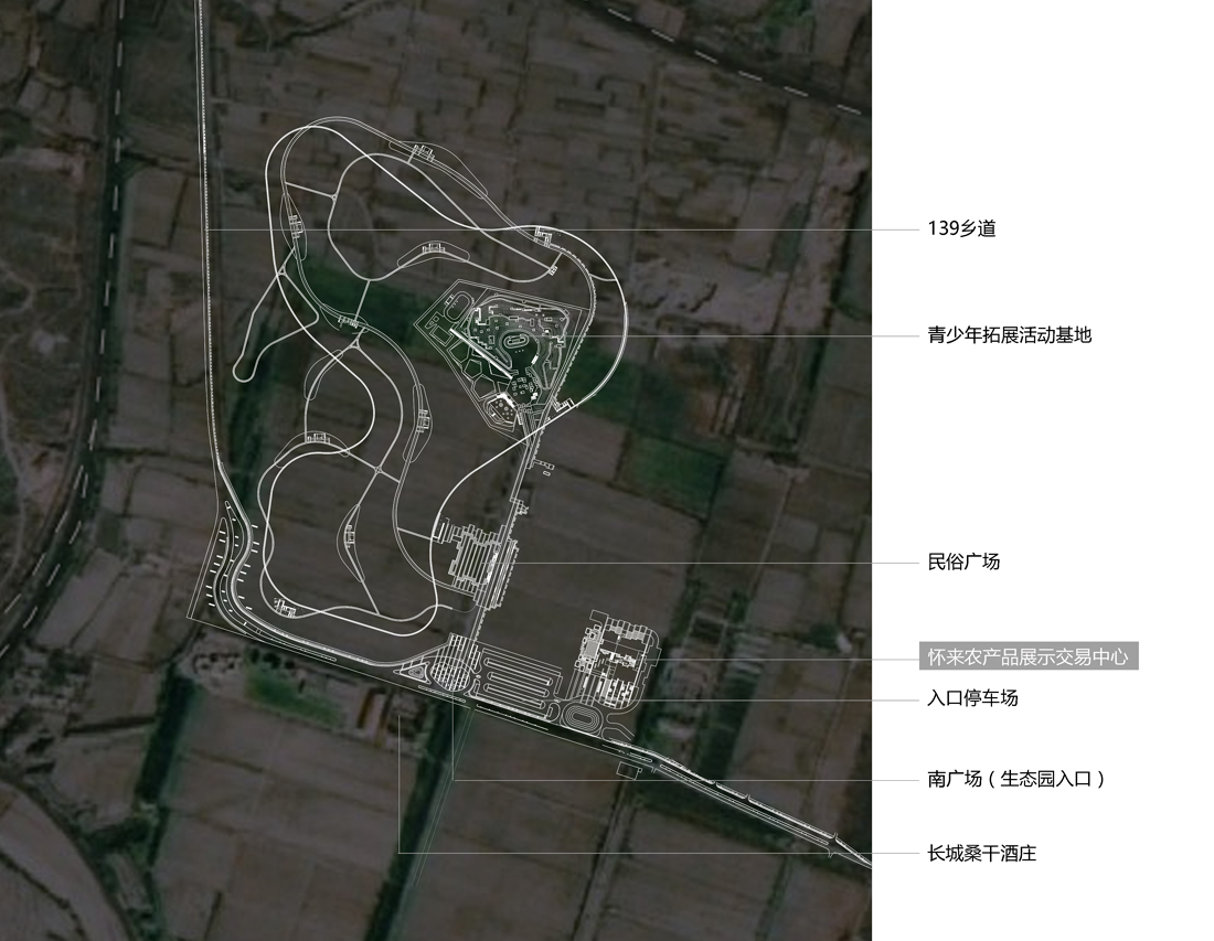 项目位于怀来长城桑干酒庄的东北侧,来源于桑干农业生态园的规划背景,是一个以葡萄相关产业为载体的文化展示和交易平台。