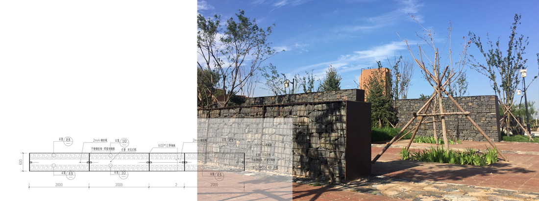 这个空间是开放式的,用一个小的高差来划分界限,周边有较高的地被草花进行软性遮挡。餐饮区利用原色榆木板来平衡石笼墙的冷硬质感,用10公分厚的榆木板分隔出多排展示架,可以放一些书籍供人取阅,也可以成为固定的葡萄酒展位。