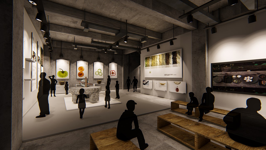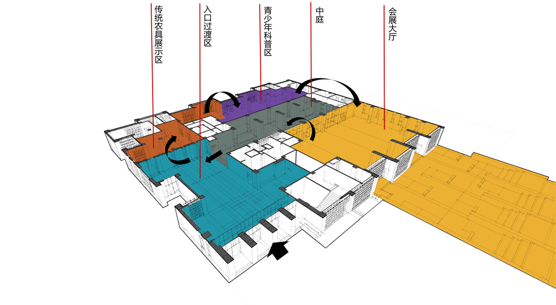 ▲首层参观流线:入口→传统农具展示区→青少年农业科普区→会展大厅→中庭景观区→入口