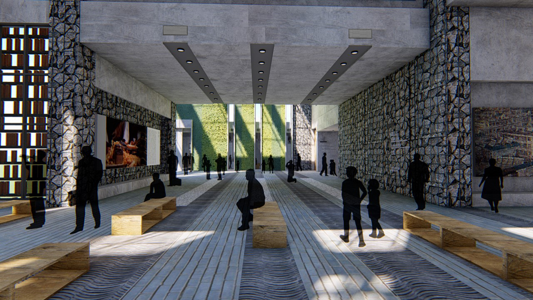 ▲入口过渡区南北向的剖面图,三个空间通过高度和光线的变化拉开层次,增强整个入口的纵深感
