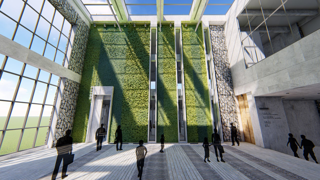 休闲大厅是人流的交汇点,三层通高的垂直绿化墙作为一个最鲜明的元素,成为整个入口过渡区域的视觉中心。绿墙植物通过自动灌溉系统得到定时养护,顶面是混凝土框架和大面积的玻璃天窗,加设折叠式天棚帘便于调节光线,保证绿墙有足够的光照。