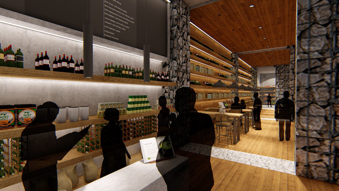 商店以灰色的混凝土墙面和吊顶为背景,将人的注意力引向商品,同时通过材料的变化,与餐饮区分开。