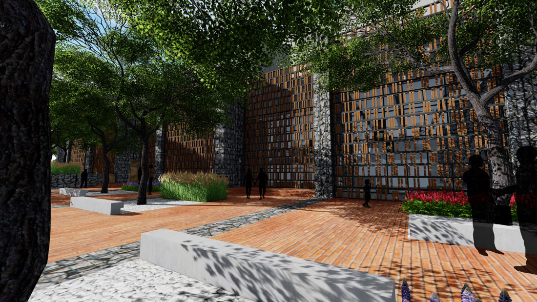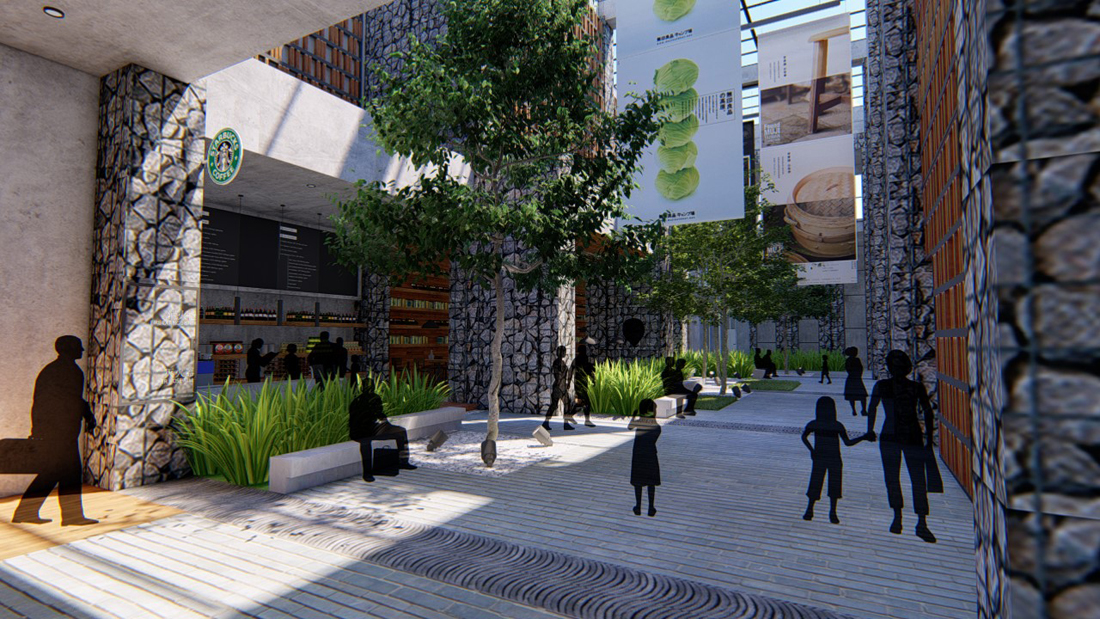 中庭区域的玻璃顶能够提供良好的光照条件,在这里栽植几株大乔木,配合层次丰富的草花地被,成为一处能够吸引人停留的景观走廊。顶部的混凝土框架上可以预留几处悬挂宣传海报的位置,使空间能够被充分利用。